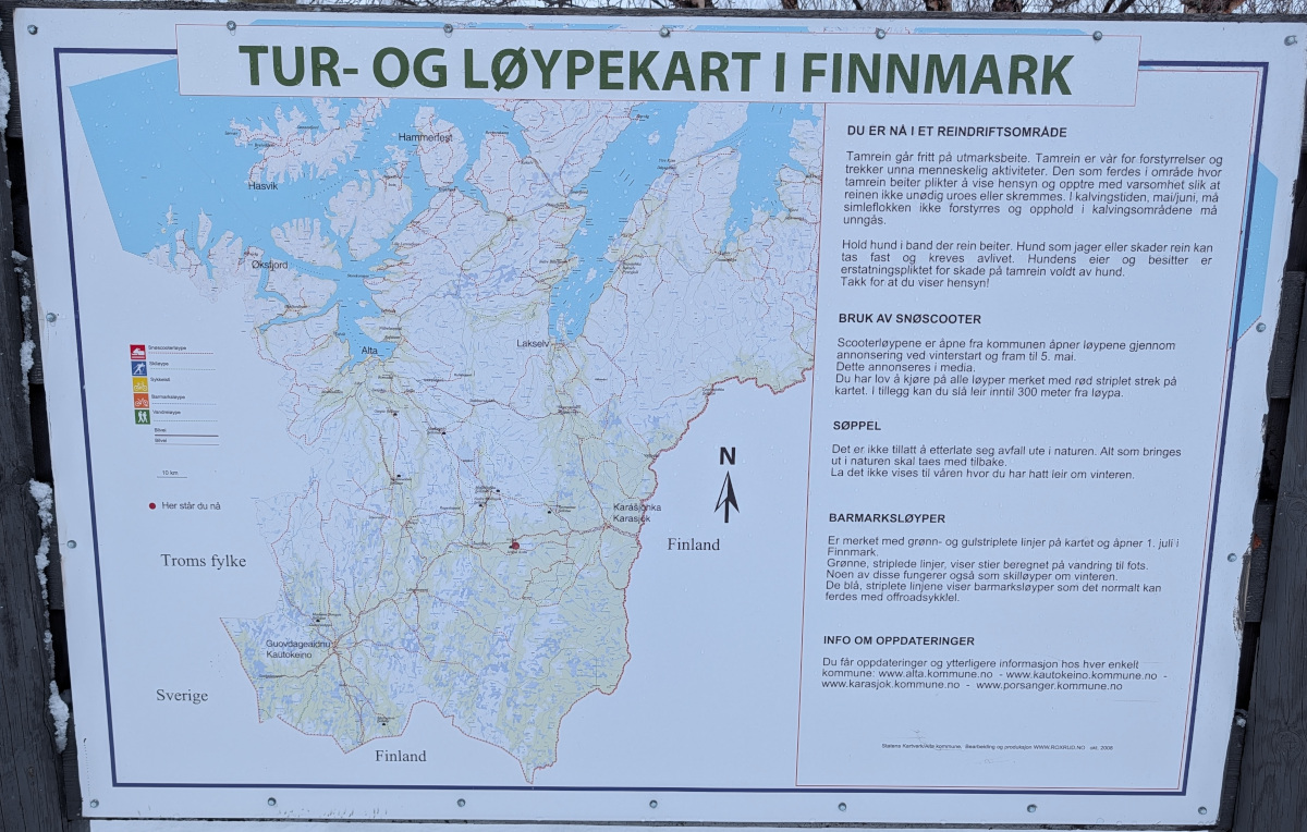 Fuori dalle città Alta e Kirkenes, esistono piccoli alberghi, guesthouse, fattorie, varie tipologie di sistemazioni concentrate in determinate aree a volte distanti fra loro. Lo standard qualitativo delle varie strutture può variare molto indipendentemente dalla classificazione ufficiale: la scelta degli alloggi è connessa alla disponibilità e l'ordine delle visite potrebbe essere invertito in considerazione dell'effettiva disponibilità stessa in ogni località. Le sistemazioni, in particolare nelle zone più isolate, sono piuttosto semplici e si richiede pertanto un certo spirito di adattamento.